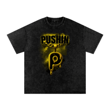 PUKKA – Pushin P – Hoodie A washed black loose-fit tee featuring the bold “Pushin P” graphic with a gold
