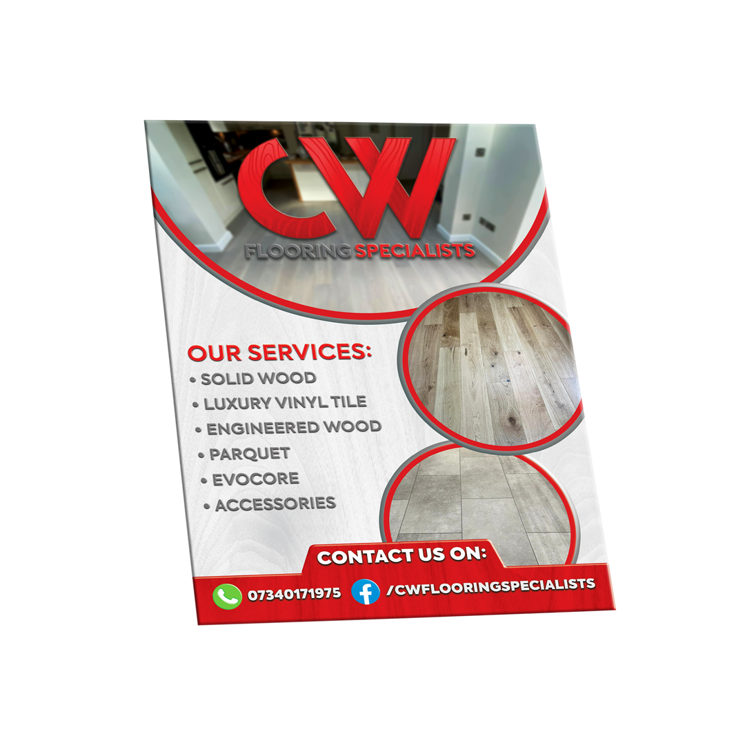 Custom printed A5 flyer design for CW Flooring Specialists, featuring services list, flooring images, and contact details.