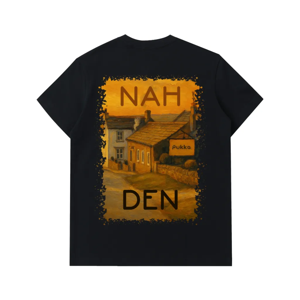 A black loose-fit tee featuring a dripping Pukka chest logo and a large countryside-style “Nah Den” artwork printed on the back. Designed for a casual streetwear look.