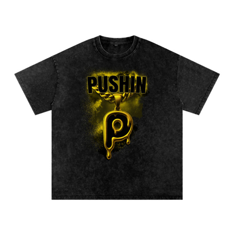 A washed charcoal-black hoodie featuring a bold “Pushin P” graphic with a gold chain-style emblem on the front. Made from a thick cotton blend in a loose fit, ideal for autumn and winter streetwear.